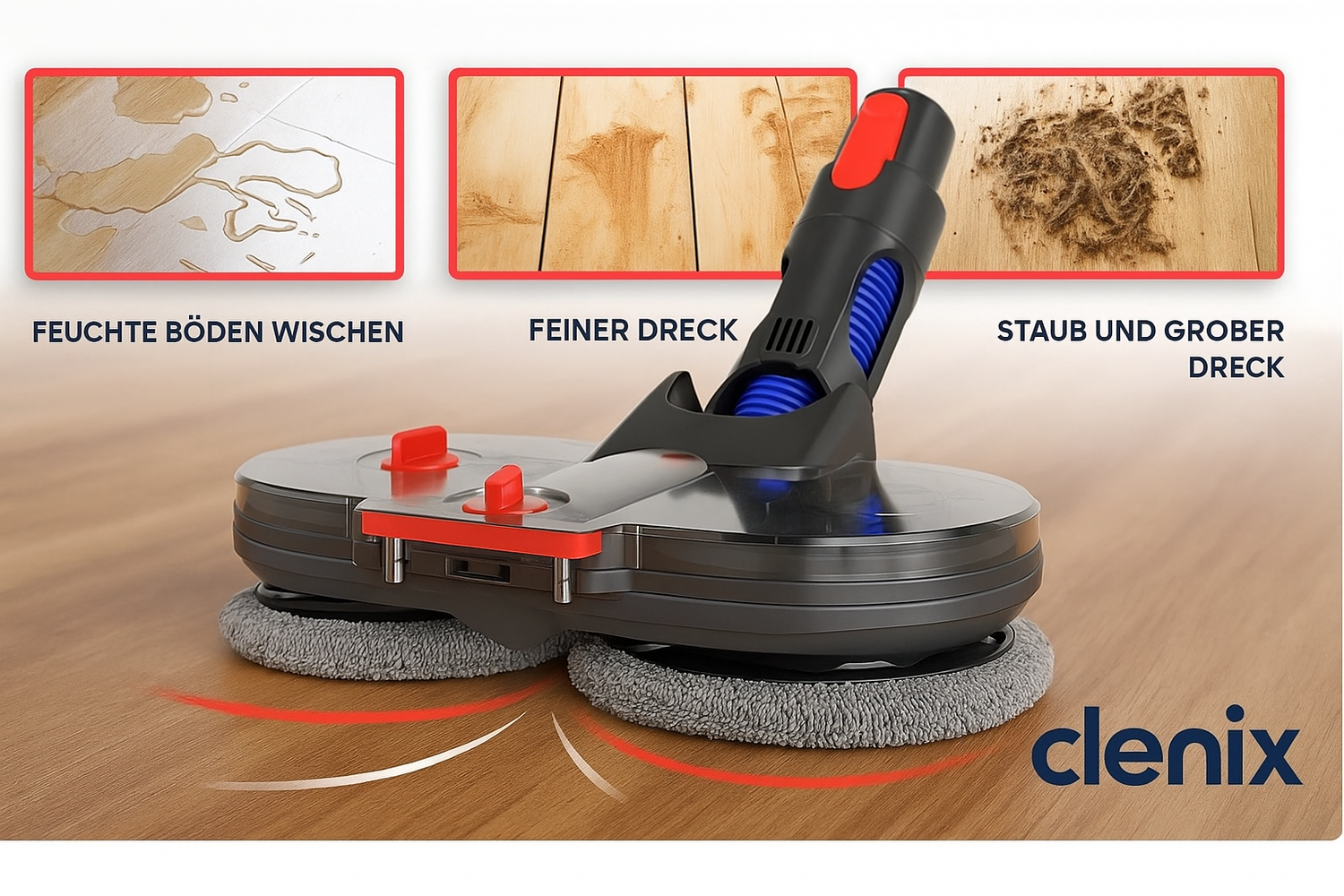 Der elektrische Wischaufsatz von Clenix hebt deinen Dyson auf ein neues Leistungsniveau – für maximale Reinigungseffizienz mit minimalem Aufwand.